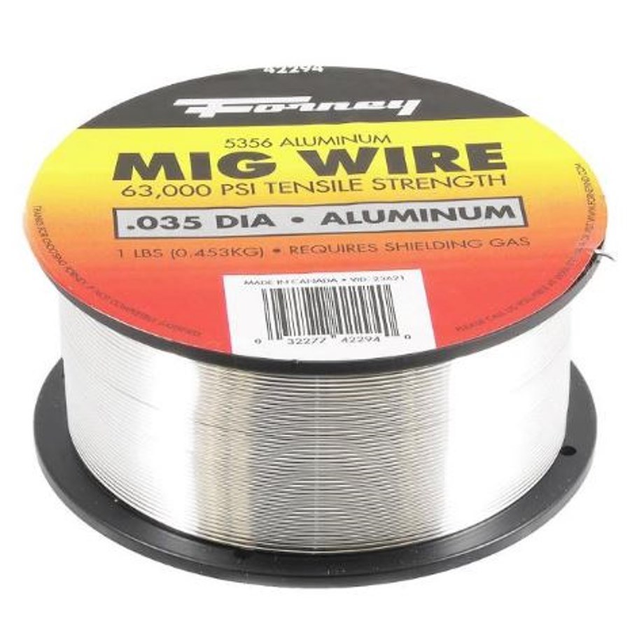 ER5356 aluminum MIG (GMAW) welding wire features 5% magnesium content and a bright finish. It flows freely at 1,180° F (637.8° C) and provides less "bird-nesting" on push-type MIG welders. Applications include diesel engine bases, truck frames, cargo tanks and gun mount bases. Light gray color coding on label.