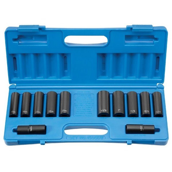 Set contains 6 Point extra thin wall deep sizes 3/4" to 1-1/16" and 17mm to 23mm plus two flip sockets 3/4" x 13/16" and 19mm x 21mm.