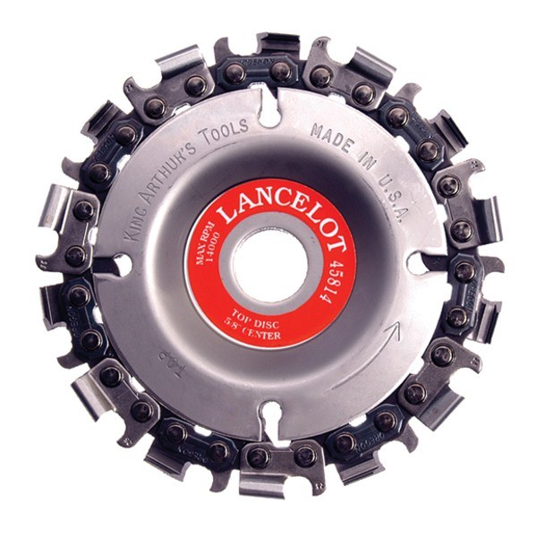 The 45814 model 14 tooth Lancelot chain saw cutter fits most 4 1/2" (115mm) and 125mm European angle grinders with 5/8"(16mm) center holes. More aggressive than the 22 tooth and leaves a coarser finish but you’ll be amazed at the smooth finish. Excellent for rapid wood removal, cutting and general shaping.