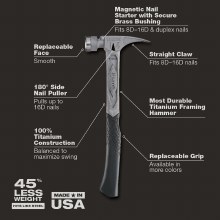 The STILETTO® 14oz TIBONE™ Hammer with Smooth Steel Face and Curved Handle is our most powerful and most durable hammer. This All-Titanium hammer is 45% less weight and hits like steel. The durable TIBONE™ design is best for framing and pulling nails. The 180° Side Nail Puller and Magnetic Nail Starter fit up to 16D and Duplex Nails. The TIBONE™ features a replaceable steel face and multiple grip colors, extending the life of the hammer and providing a personal touch.