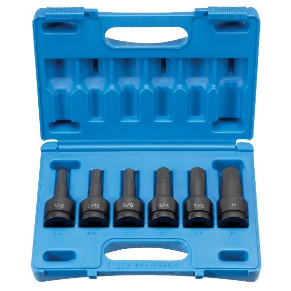 Set contains one piece impact hex drivers in sizes 1/2" to 1"