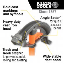 Klein Tools’ conduit benders with Patent Pending Angle Setter™ technology allow for quick, accurate repeated bends. The wide foot pedal provides excellent stability and features angled grooves for extra traction. With easily visible bold cast-in benchmark symbols, degree scales and multiplier scales help save time on the job.