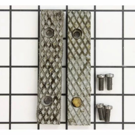 Serrated jaw inserts for Wilton WS4 bench vise. Two metal inserts with mounting screws. Hold workpiece securely. Trust this genuine OEM part, designed to fit your machine. For installation steps and tools, related parts and precautions, refer to your owner's manual and model schematics.