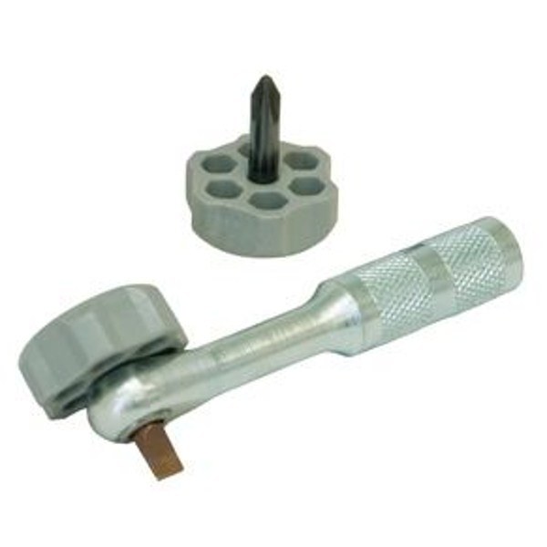 Makes it easy to remove and install molding around fender wells and other tight places. Place handle over the bit and turn. Reverse handle on bit to tighten. Can also be used with 1/4" round shaft screwdriver. Ratcheting action with infinite settings. Includes straight slot and #2 Phillips bit assemblies.