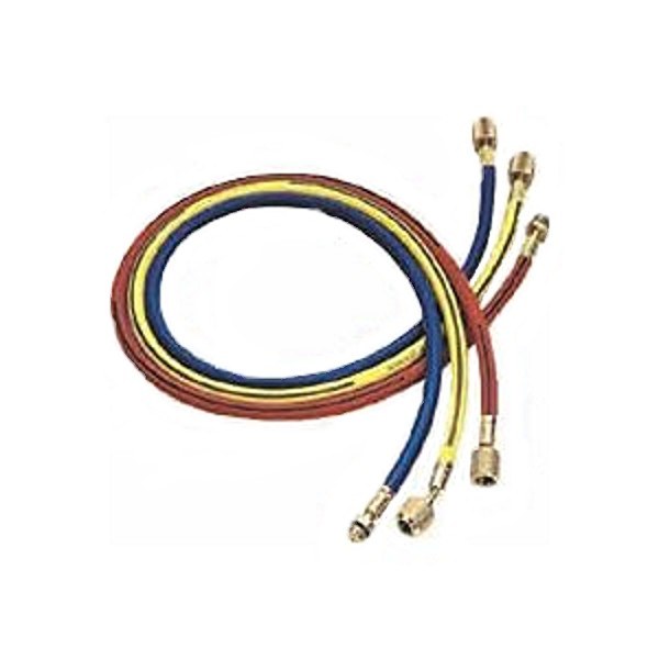 Mastercool Hose Set with Automatic Shut-Off Valve is designed to stand the test of time with knurled brass nuts that make finger tightening easy . This tool is available both individually as well as in set. The hose is tested for working pressure of 750 PSI and burst pressure of 3000. It includes blue, red and a yellow hose.