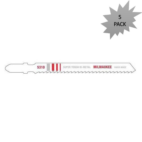 Get professional-grade performance and longer blade life with the Milwaukee® 4" 10 TPI Bi-Metal T-Shank Jig Saw Blade (5-Pack). These heavy-duty blades last longer than high-speed steel or carbon blades, combining the strength to cut metal with the durability to withstand impacts without breaking. With Milwaukee’s attention to blade material, tooth shape and sharpness, the jig saw blades produce clean, fast cuts in nail-embedded wood. The T-shank allows for quick installation. Use with Milwaukee jig saw models 6266-6, 6276-6, 6267-20, 6267-21 and other popular brands.