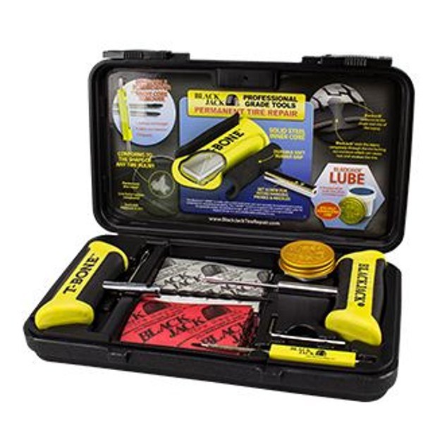 (New Item) Tire Repair Kit. Includes T-Bone Handle w/ spiral probe,T-Bone Handle w/ 4" open eye needle, spare 4" open eye needle, screwdriver with reversible shaft & valve core tool, hex wrench, specially formulated lube, razor blade and 40 repairs ( 20 4" large dia., 20 4" small dia.) in a custom form fitted case.