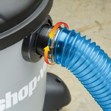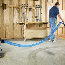 The 2-1/2'' diameter hose in this kit is made of an amazingly elastic, flexible polymer that stretches from approximately 2' to 12' in length. This allows you to reach most areas of your shop, without the hassle of a long, cumbersome hose. As you move closer to your shop vacuum, it retracts to take up excess slack, which helps prevent tangling and tripping. Thanks to the flexibility of the hose, coupled with the included swivel connectors, it won't kink or bind. The hose weighs 30% less than previous versions, and is offered in a blue translucent color. With the two included swivel fittings, it easily connects to your shop vacuum, optional Dust Right® accessories and many dust ports. Each swivel fitting has a larger end (2-1/2'' OD), which fits into the hose, and a smaller end (2-1/4'' OD), which fits into a standard ''Shop Vac.'' Two metal hose clamps are also included for securing the fittings to the hose.