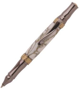 Our popular Nouveau Sceptre design is now available in this easy to make, single tube, 24kt Gold and Gun Metal plated ballpoint twist style. Designed by accomplished pen designer David Broadwell, this pen comes to life with custom casted 3-D Art Nouveau design components and premium plating. Includes a smooth writing Parker™ style refill.