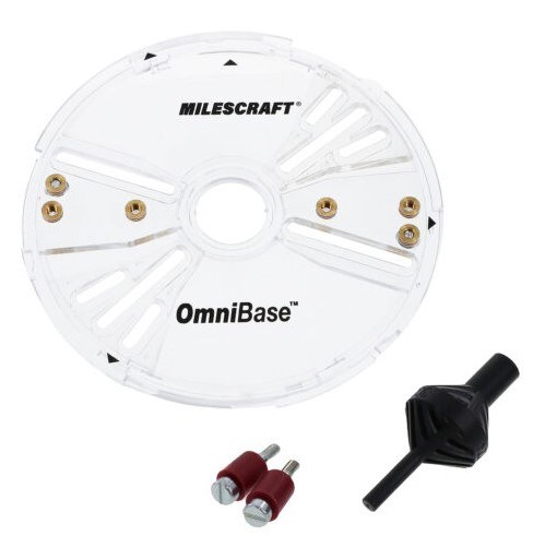 The OmniBase™, by Milescraft, is the next generation in universal router bases. The 7” router base is compatible with nearly ever router, from small trim routers to full-size. This is possible due to its patented adjustable swivel mounting wings. Secure one or both fixed mounting locations to your router, then swivel the others to align. The OmniBase™ also is compatible with all of the other TurnLock™ jigs from Milescraft, making it a must have accessory to connect your existing router to all of the other jigs from Milescraft.