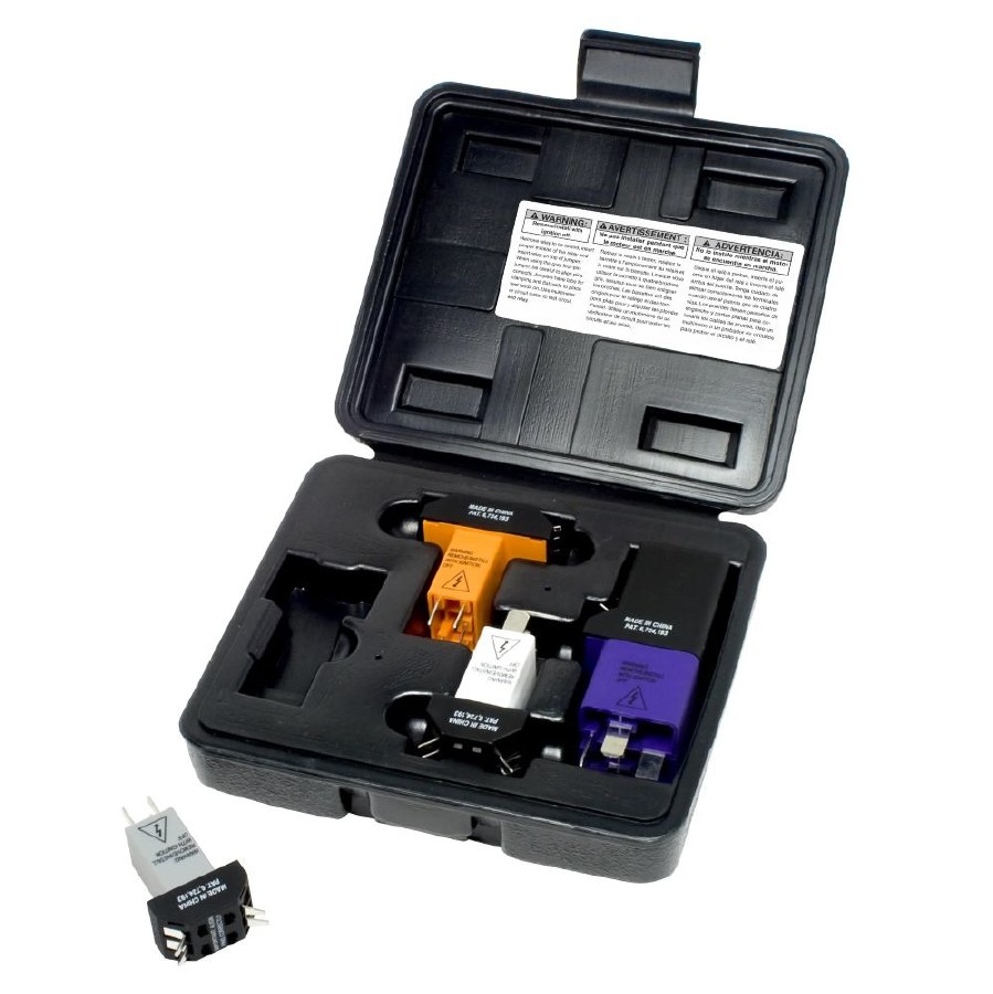 Set includes four jumpers to fit many popular relays on Honda, Nissan, Toyota, newer Ford and GM mini micro relays as well as International trucks. Set comes in blow-molded case for storage. Simply remove relay to be tested, insert correct jumper and insert relay into jumper. When using grey four pin jumper be careful to align pins on jumper and relay correctly. No need to pierce wires or connect multiple jumper wires. Jumpers have tabs for clamping and flat pads to place test leads on.