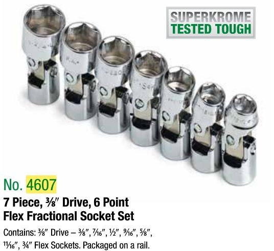 3/8", 7/16", 1/2", 9/16", 5/8", 11/16", 3/4" Flex Sockets. Packaged on a rail.