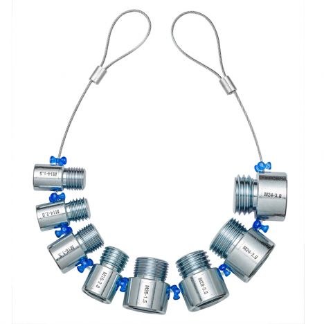 Whether you're organizing loose hardware or trying to identify a specific thread pitch so you can purchase replacements, the Thread Detective is the perfect tool for the job. Sets are available in three size ranges: Mini, Original and Jumbo. Each of these sets is in turn available in either imperial (red spacers; #53816, sold separately) or metric (blue spacers; listed here). All sets feature clearly marked gauges for quick identification of the size and thread pitch of both nuts and bolts. One end of each gauge checks the nuts, while bolts can be checked by threading them into the other end. Each set of gauges is strung together onto a wire lanyard that can be hung from a nail for convenient storage.